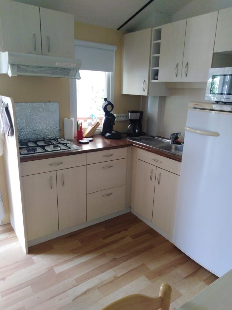 - 1 cuisine avec plaques gaz, frigidaire avec partie congélateur, micro-onde, cafetière et grille pain